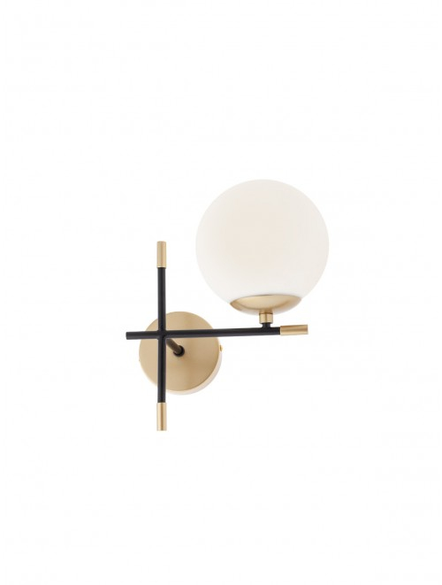 Aplica de perete Essential, impresioneaza printr-un design elegant si sofisticat care imbina finisajele negru mat si auriu mat cu un abajur din sticla opala, creand un efect vizual placut si o lumina difuza. confortabila.