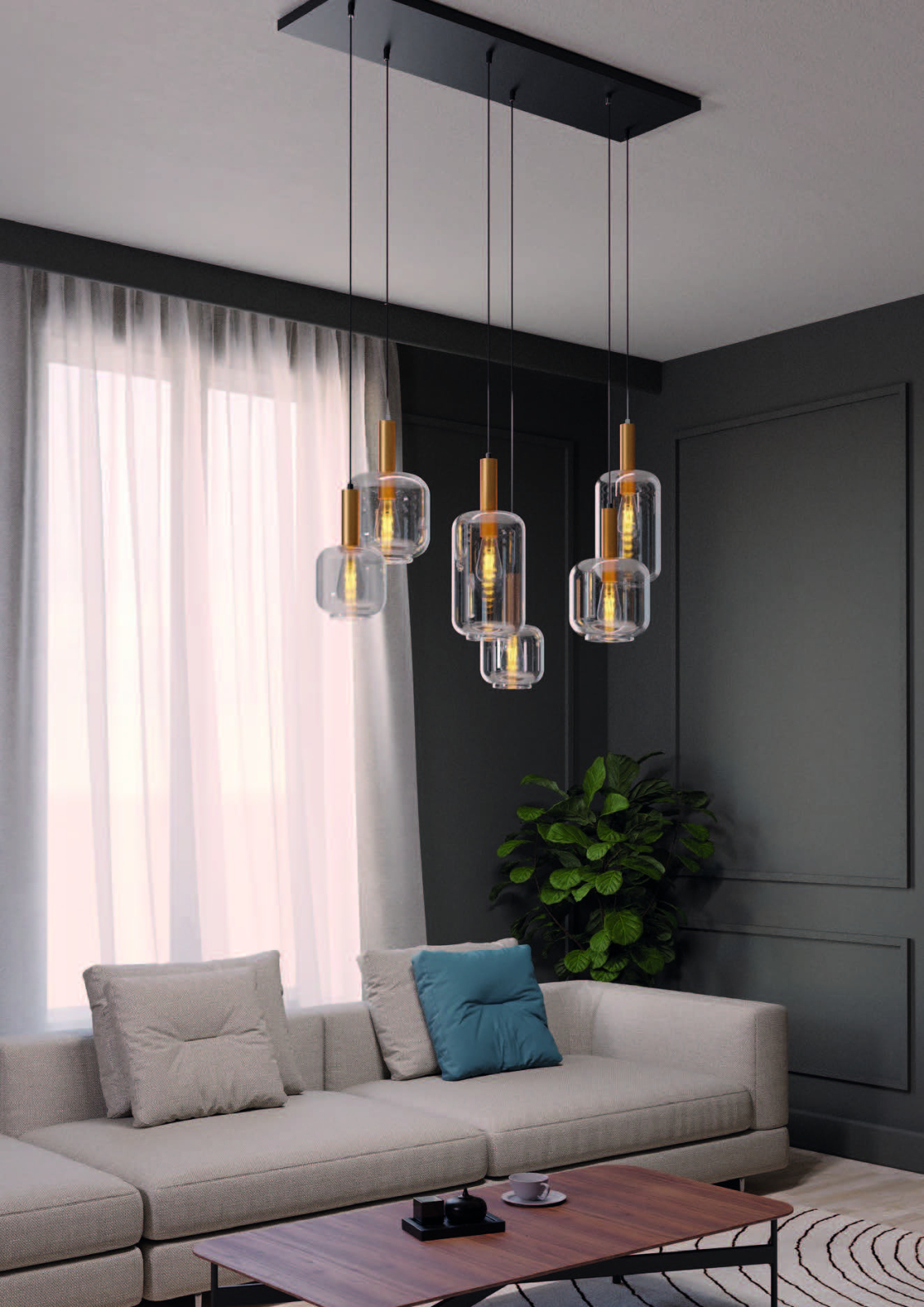 Suspensie Brina, cu un design modern si elegant, echipata cu sase dulii E27, compatibile cu becuri de pana la 23W, care ofera un iluminat amplu si placut in intreaga incapere.