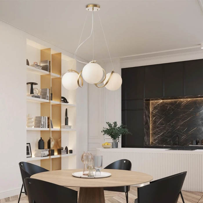 Lustra Kaya, este un corp de iluminat decorativ si modern, cu un aspect sofisticat dat de sticla alba mat si structura metalica, ideala pentru toate spatiile.