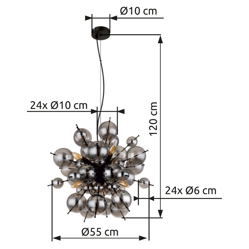 Suspensie Udo impresioneaza prin designul modern si spectaculos format din globuri de sticla fumurie care difuzeaza delicat lumina.Structura metalica neagra adauga un plus de rafinament .