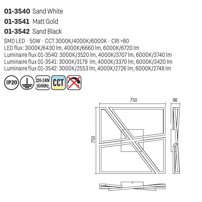 Plafonieră de interior, echipată cu LED-uri SMD, cu posibilitatea de selectare a temperaturii de culoare a luminii, structură metalică cu finisaj auriu mat, difuzoare acrilice alb opal