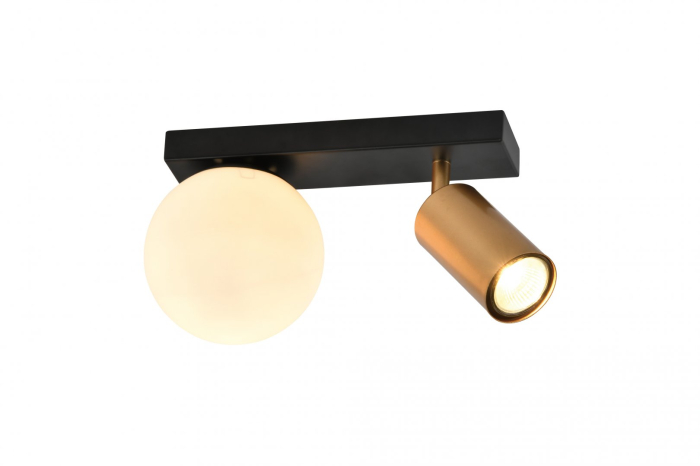 Plafoniera Spoty AP2, cu un design minimalist-industrial, care combina metalul negru cu accente de alama si un abajur din sticla opal.